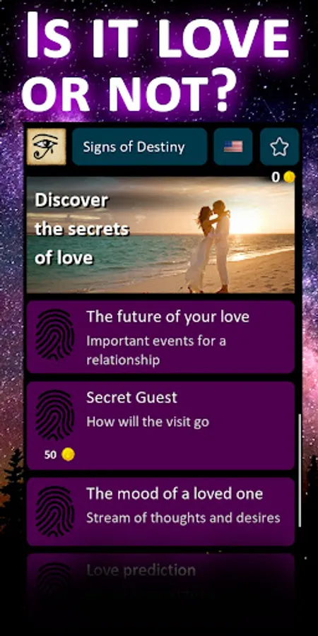 Divination for love by the Signs of Fate will open your common future. Think about your loved one and give the Signs your fingerprint.