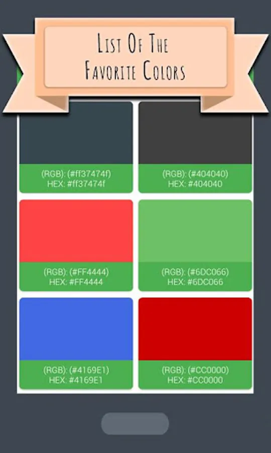 You can get the Hex Code and RGB values of most likely used colors around the globe.