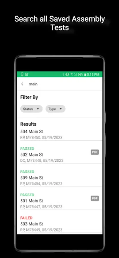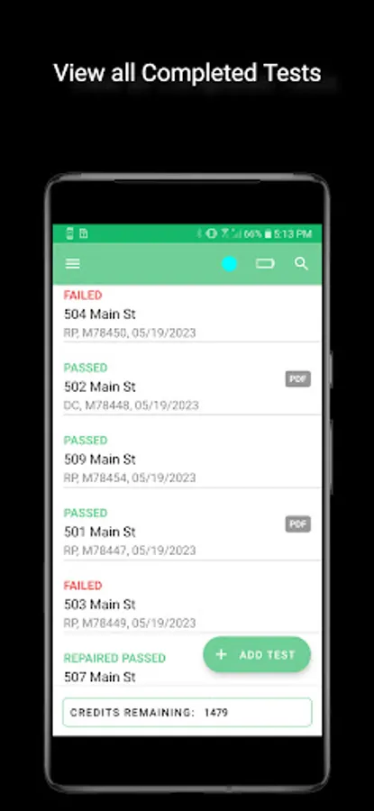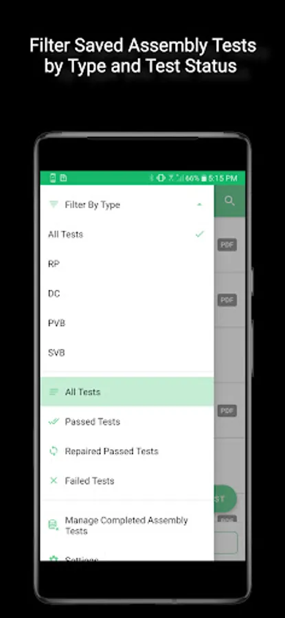 Retrieve and review previously completed tests. Tests can be filtered by All, Passed, Repaired, Failed and by RP, DC, PVB or SVB.
