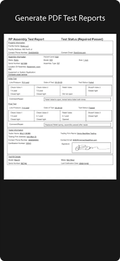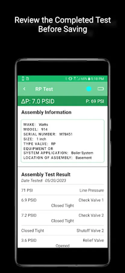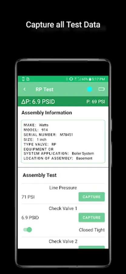 The app can be used to test all 4 of the current testable backflow prevention assemblies (RP, DC, PVB, SVB) with all known test procedures.