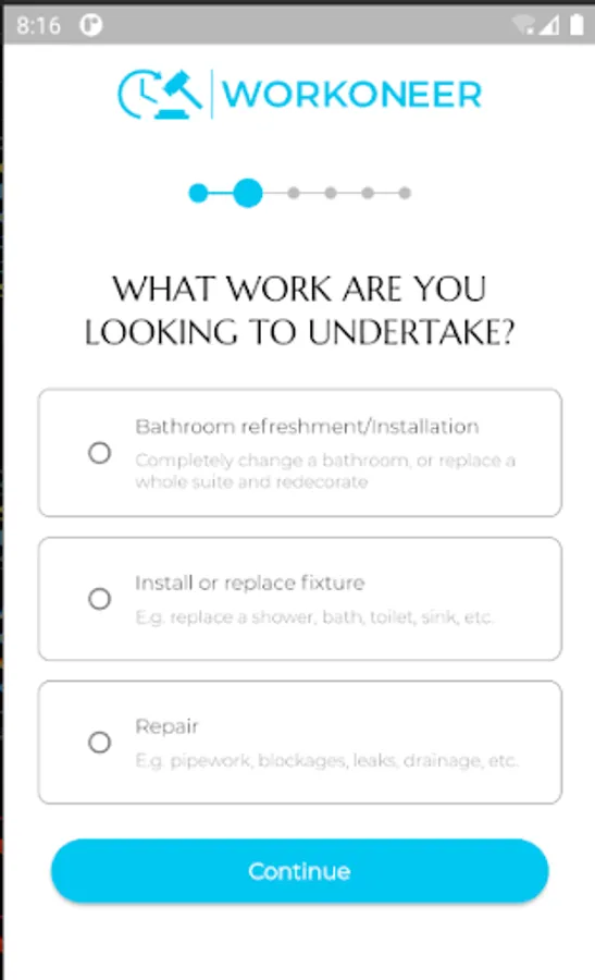 The first auction for any trade - get the best tradesman to get your any job done in best price. Workoneer Client will publish the work, our admins will review and make your jobs live. When auction is live - real time bidding will go on and you can see the bidders when auction ends with their bid price.