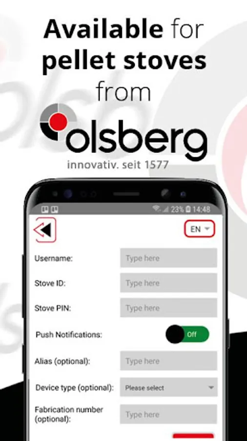 To connect the app with your pellet stove, enter the connection details in the configuration screen. All necessary information can be found directly in the menu of the stove: menu – network – app settings.