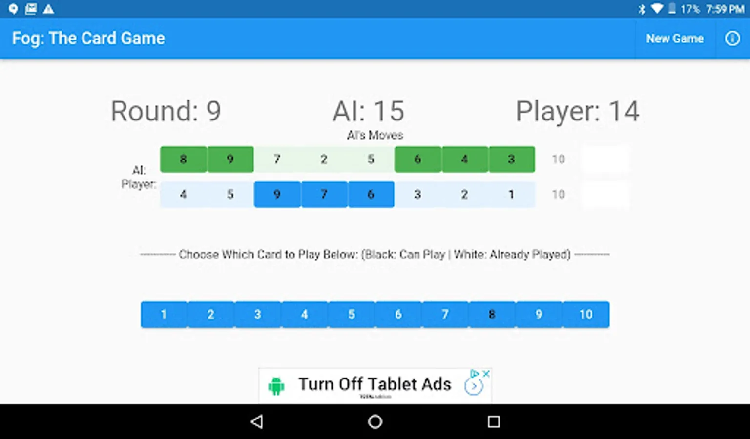 Fog is a simple, but fun "card" game based on the classic card game War. The twist is while War is random and you don't control what cards you play, with Fog you make the choice. You have 10 cards to score the maximum against your opponent. What makes Fog different is that not only do you need to win a hand, your points depend on how well you will (or lose).