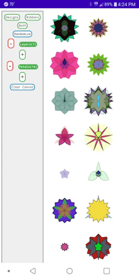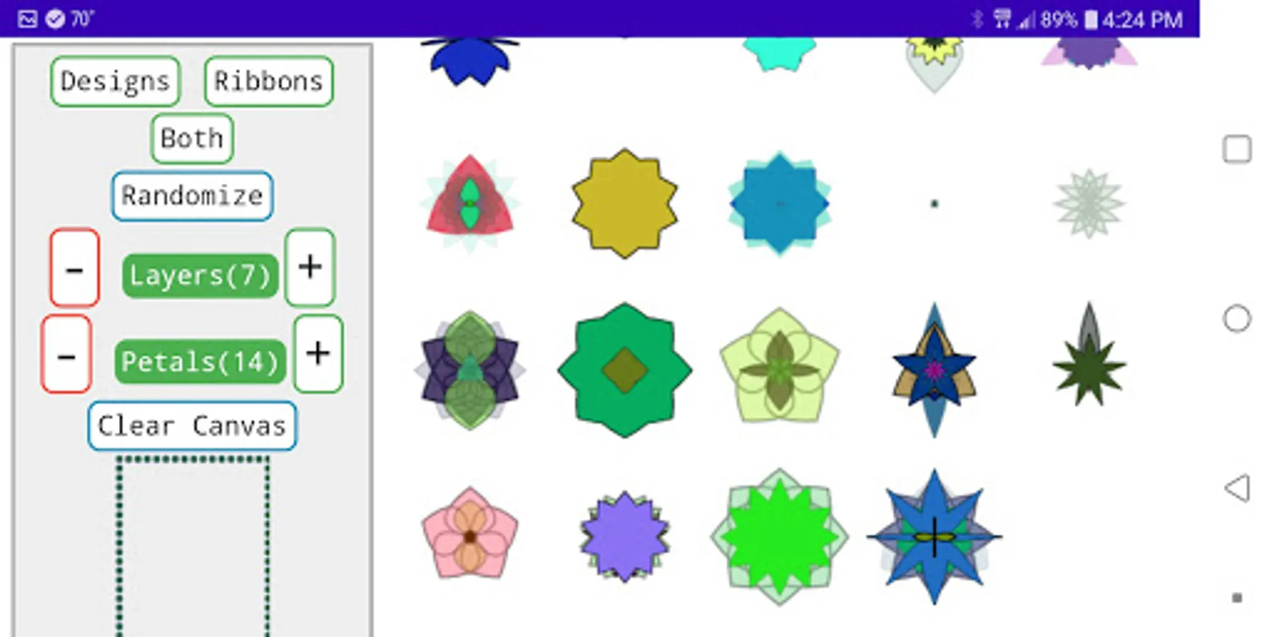 The app generates nearly unique designs. Quickly change the maximum number of layers and “petals” in your design with the minus and plus buttons on either side of the layers and petals buttons. Optionally, choose generated ribbons of various shapes for use in the design. Browse the generated designs with a swipe, or press “Randomize” to generate all new images.