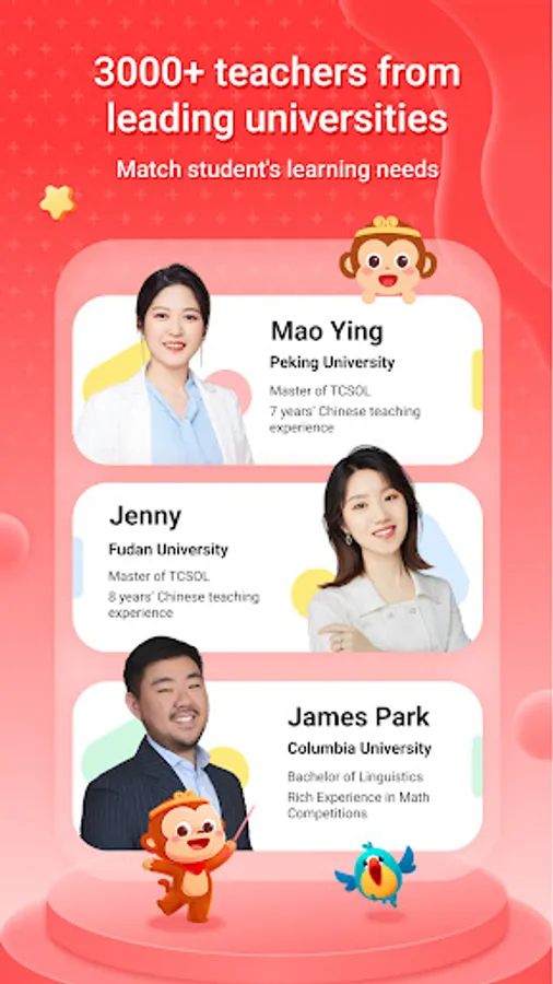 · Top-rated teaching force: All teachers have more than 5 years of teaching experience. 1% selected excellent teachers are “one in a million”, each teacher is 100% guaranteed - to hold a Professional Teacher Qualification Certificate.
