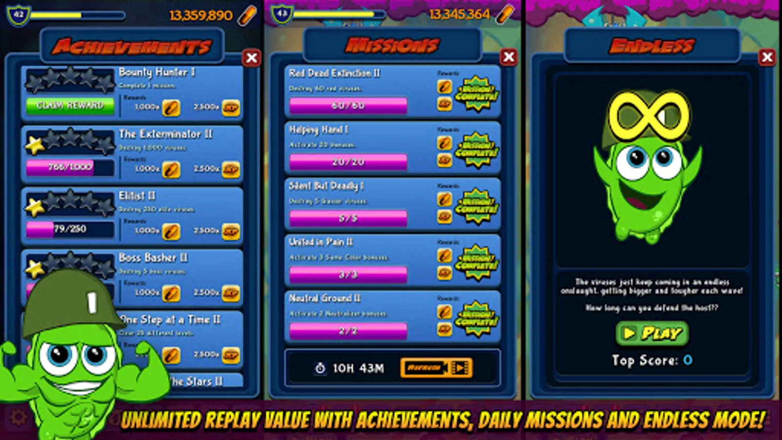 The 9 elite viruses constantly change up the game-play with custom powers and abilities. You will have to put on your thinking cap to defeat our 6 unique bosses.
