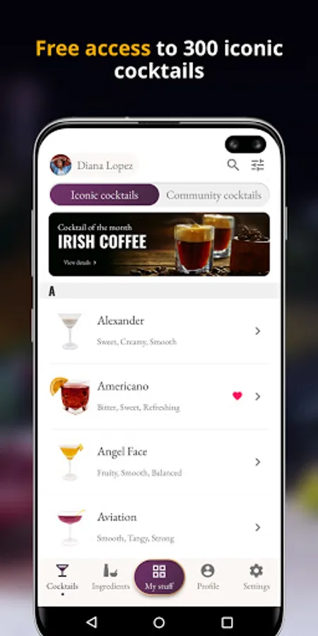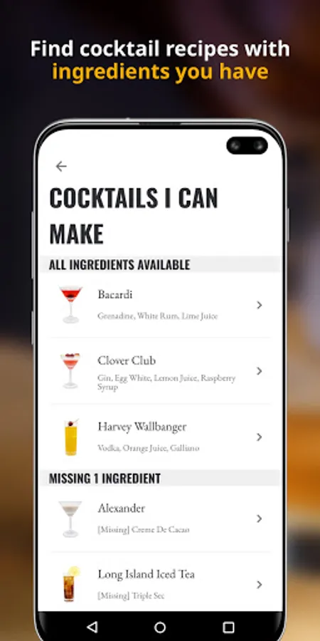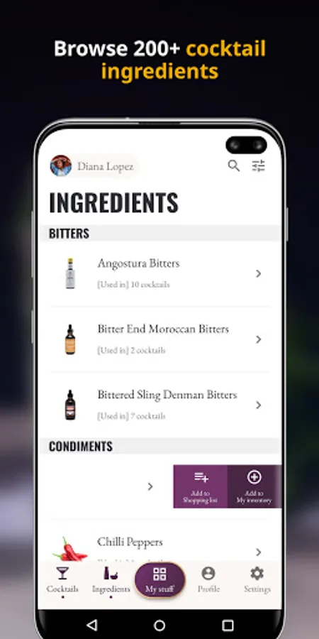 Access over 200 ingredients in "My Bar" - complete with information on what cocktails they're used in. Add these ingredients into your inventory in "My Bar" to see what cocktails you can make.