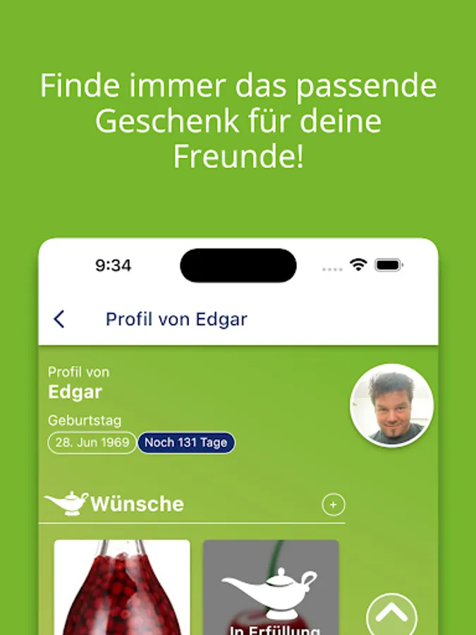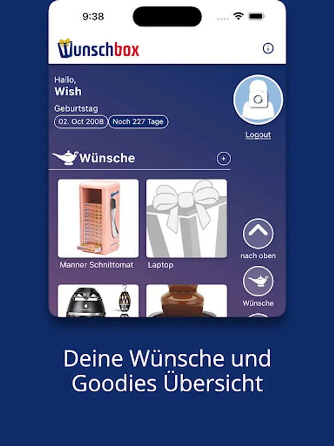 Do you know the feeling of looking for the right gift but just can't find it? With the wish box you now have a digital wish list on your mobile phone, where your friends, family or sweetheart can easily enter all your wishes. You can even look it up on the go and bring the right gift for a birthday, party or housewarming. Or you can simply order the gift in the online shop of your choice. Let the practical countdown function remind you of birthdays and look forward to even more functions!