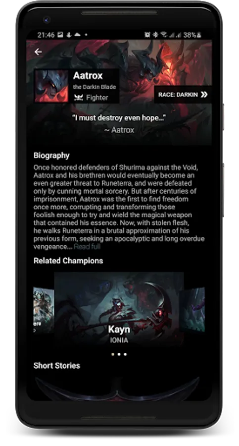 League of Legends is a beautiful game both in & out with amazingly developed characters. Get to know more by experiencing the magical world of Runeterra through a vast collection of biographies, stories, audio and arts. We even feature an inspirational quote from a random champion in every app launch just for you to stay motivated and learn something unique all the time.