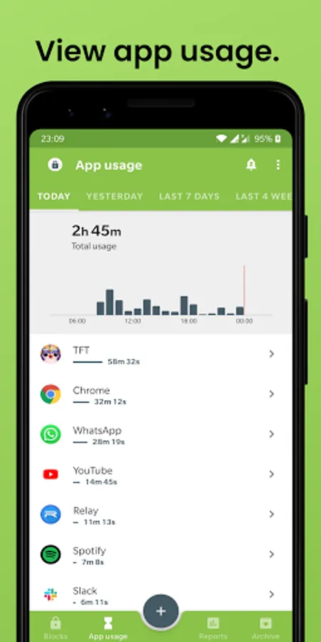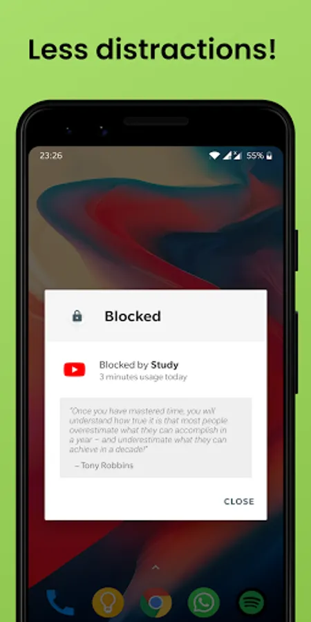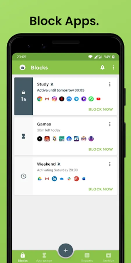 Block is an easy-to-use Android application that improves your self-control by blocking or limiting your app usage and giving you insight into how your time is spent on your phone. Whether you need to focus on your 🎓 study, don't want to get distracted at 💼 work, can't go to 🛌 sleep at night, or want to be more 👥 social, this app can help you out.