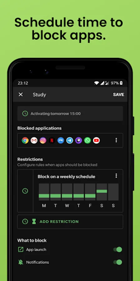 Select a group of apps and create a custom time schedule during which these apps will automatically be blocked. The schedule is fully customizable, allowing you to set different times on different days in the week, allowing you to create productive habits. An active block cannot be turned off so that it prevents you from using distracting apps.