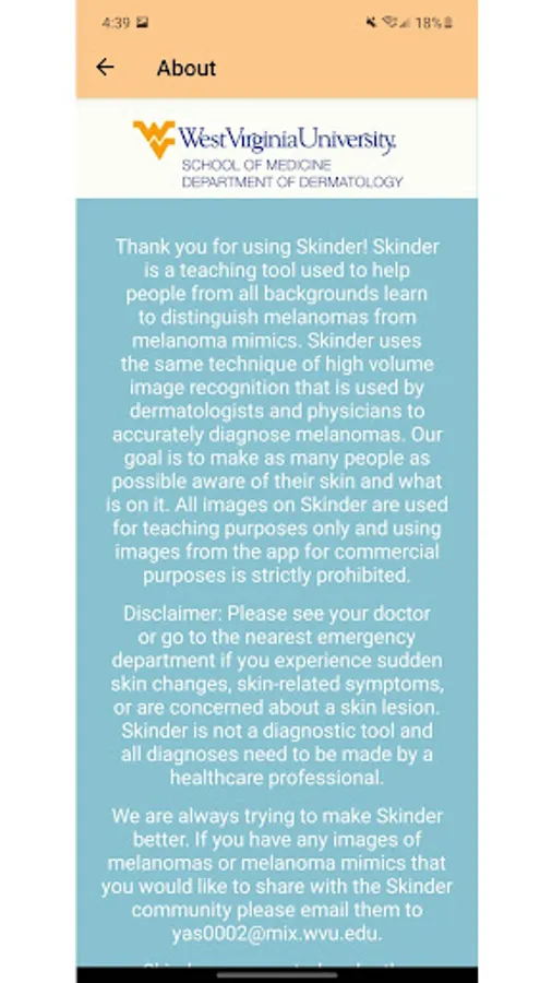 Thank you for using Skinder! Skinder is a teaching tool used to help people from all backgrounds learn to distinguish melanomas from melanoma mimics. Skinder uses the same technique of high volume image recognition that is used by dermatologists and physicians to accurately diagnose melanomas. Our goal is to make as many people as possible aware of their skin and what is on it. All images on Skinder are used for teaching purposes only and using images from the app for commercial purposes is strictly prohibited.