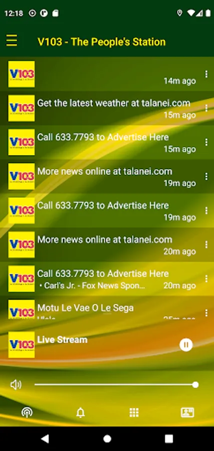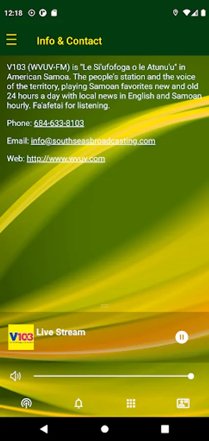 Listen to V103 (WVUV) radio and Talanei news in American Samoa. Le Si'ufofoga o le Atunu'u - The People's Station - right on your phone or tablet. See a schedule of your favorite radio personalities as well as the title and artist information for every song we play. You can also listen to our sister stations 93KHJ (KKHJ) and 104.7 The Beat (KKBT).