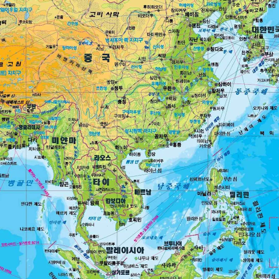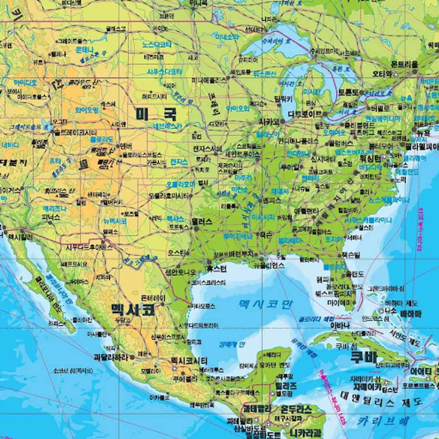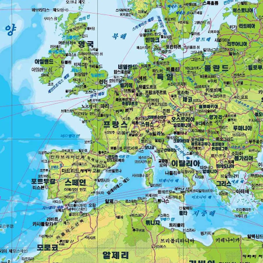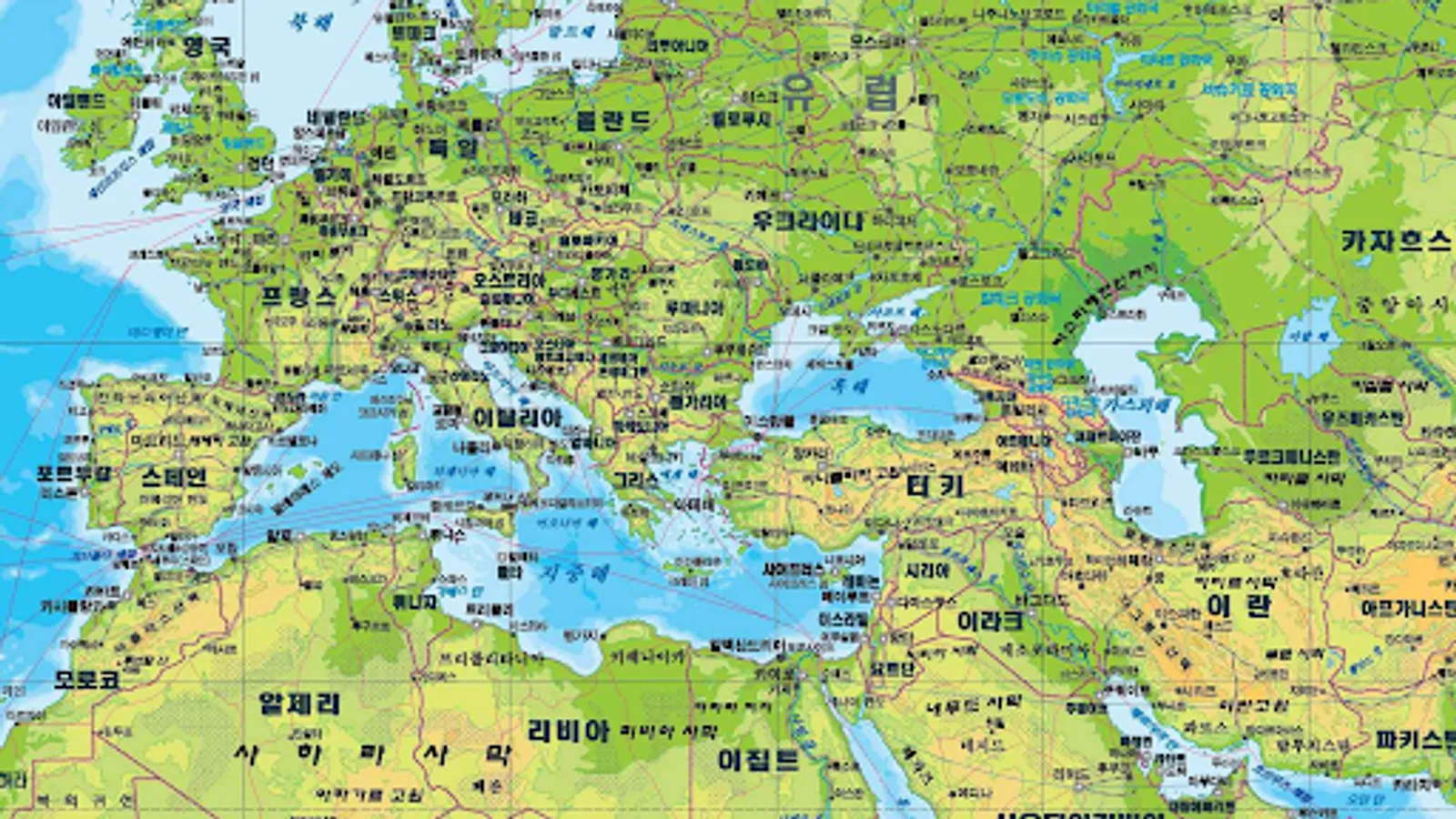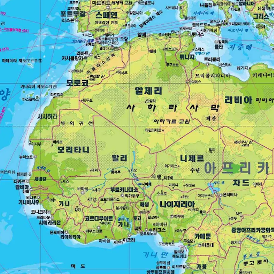 Find the 2023 world map written in Korean with countries, capitals, major cities and roads. A large world map with country and city names written in Korean.