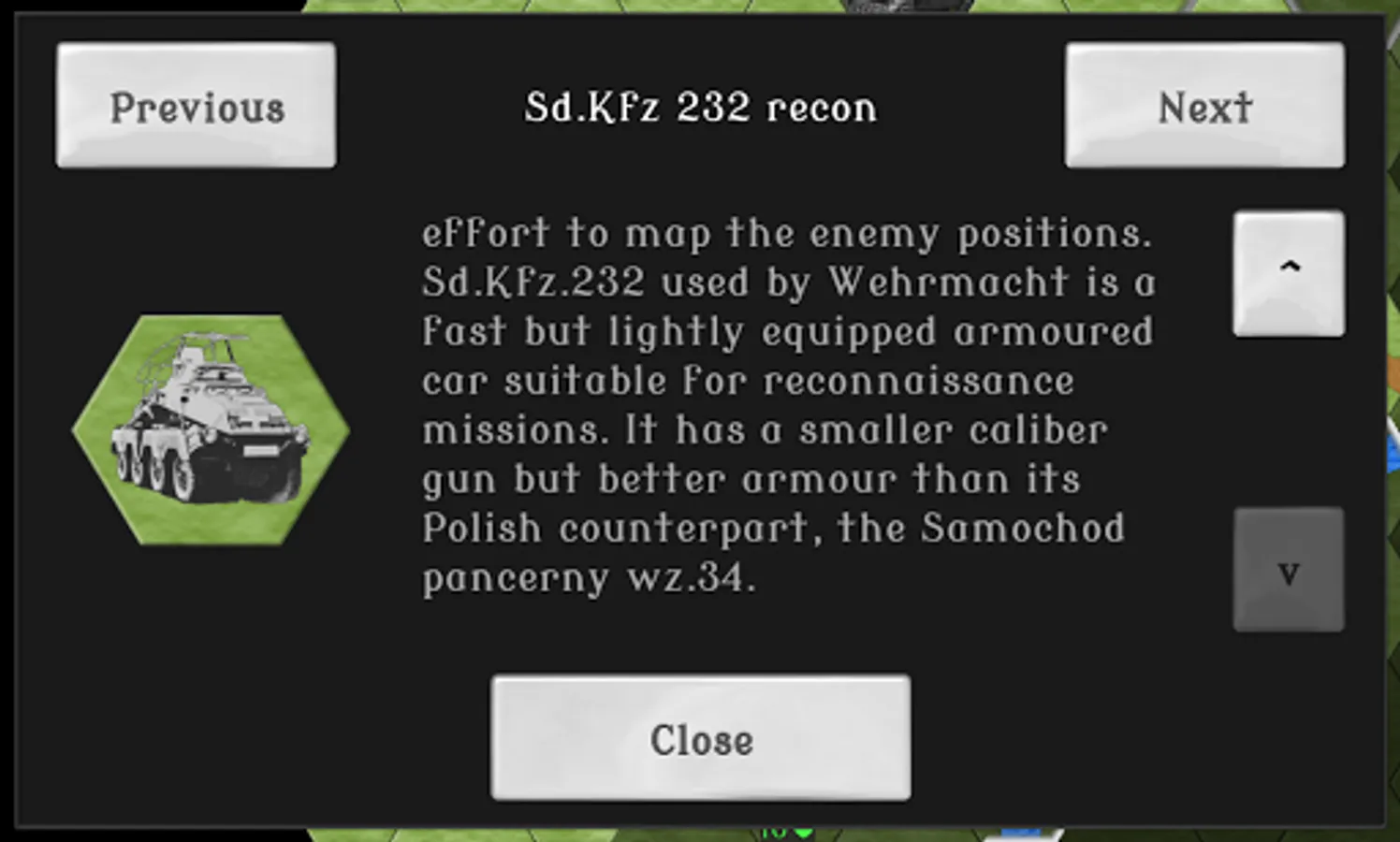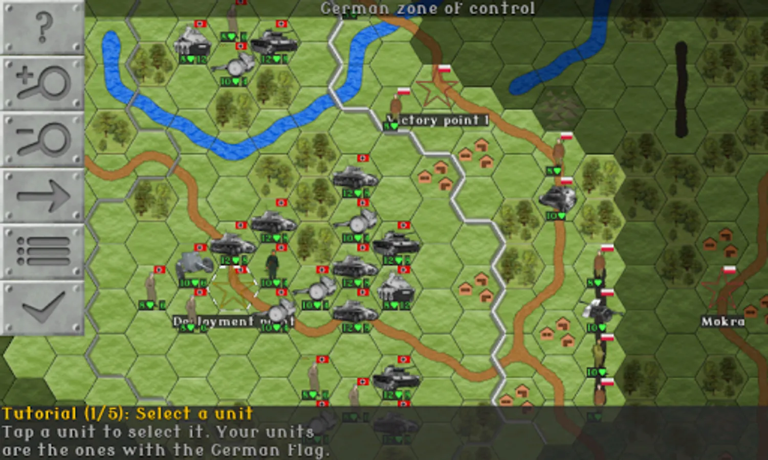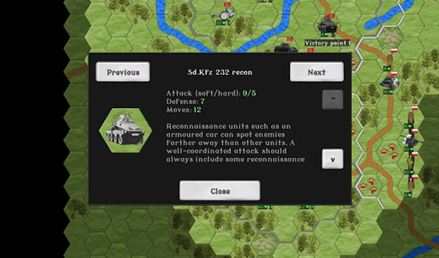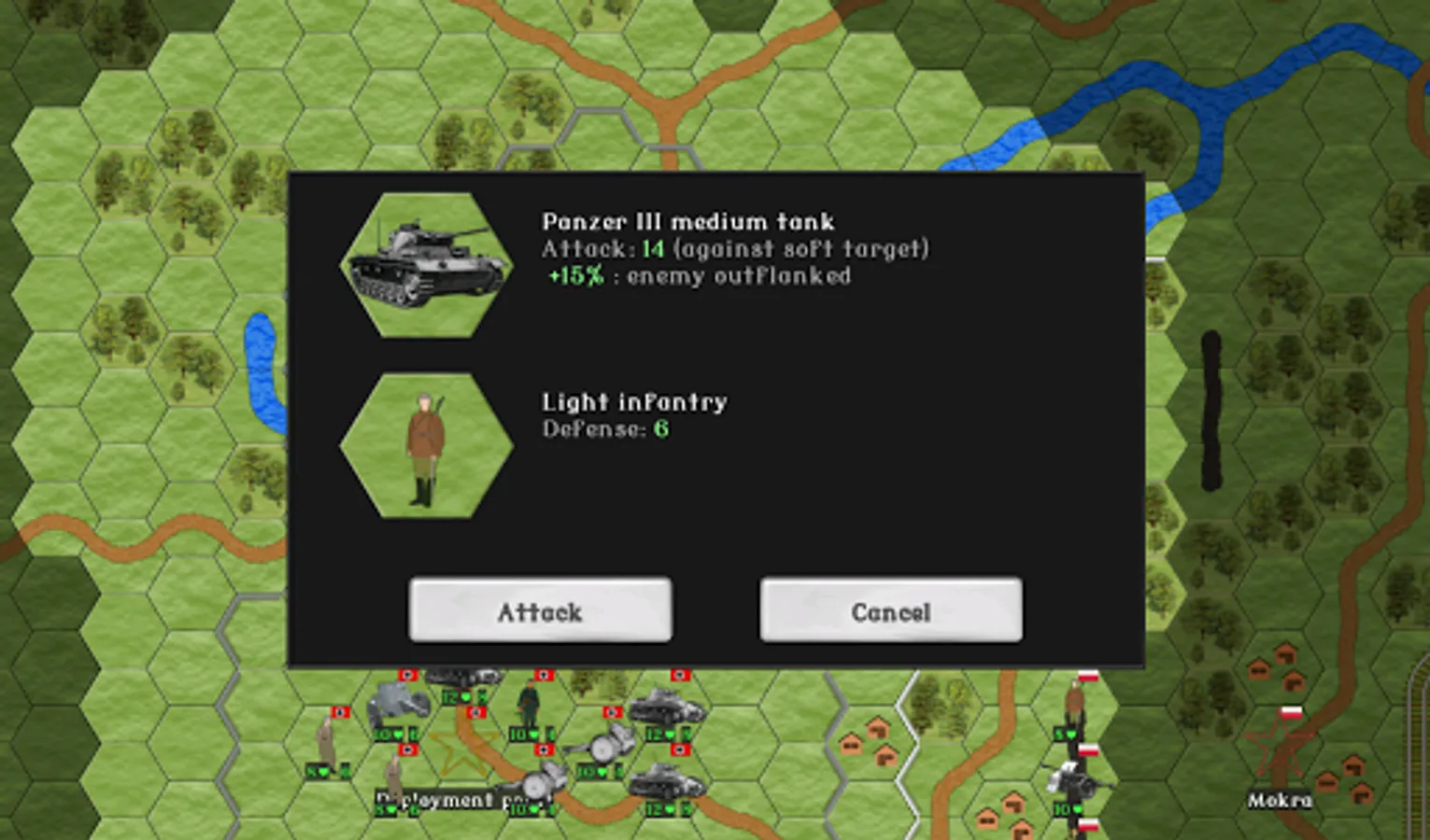 Fans of hardcore hex strategy games might enjoy the fact that the game has actual World War II era German and Polish combat vehicles and armament, supply line mechanics, artillery counter attacks, maps based on the actual historical battles, and so forth. (Some liberties have been taken in interpreting few of the details, to make the game more entertaining. But we've tried to be as close to the course of events as possible.)