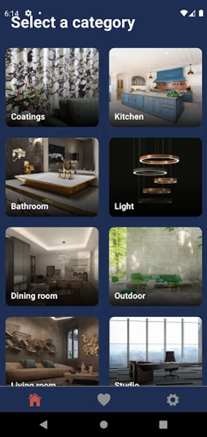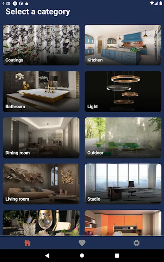 For convenience, the app is divided into zones. Here you will find many ideas for living rooms, kitchens, bedrooms, bathrooms, offices. In addition, we have added sections for outdoor items, swimming pools, lighting and sports equipment. A special section was dedicated to materials for interior decoration made of wood, marble, mosaic. The latter area includes textile.