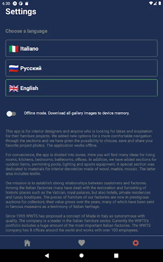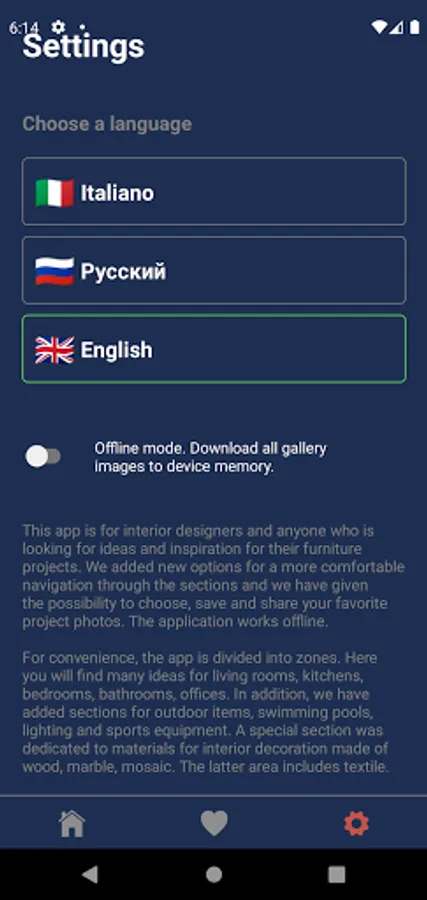 This app is for interior designers and anyone who is looking for ideas and inspiration for their furniture projects. We added new options for a more comfortable navigation through the sections and we have given the possibility to choose, save and share your favorite project photos. The application works offline.