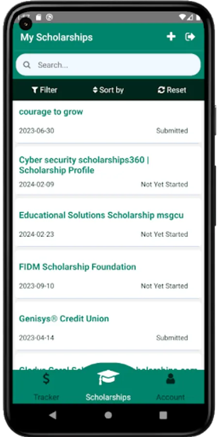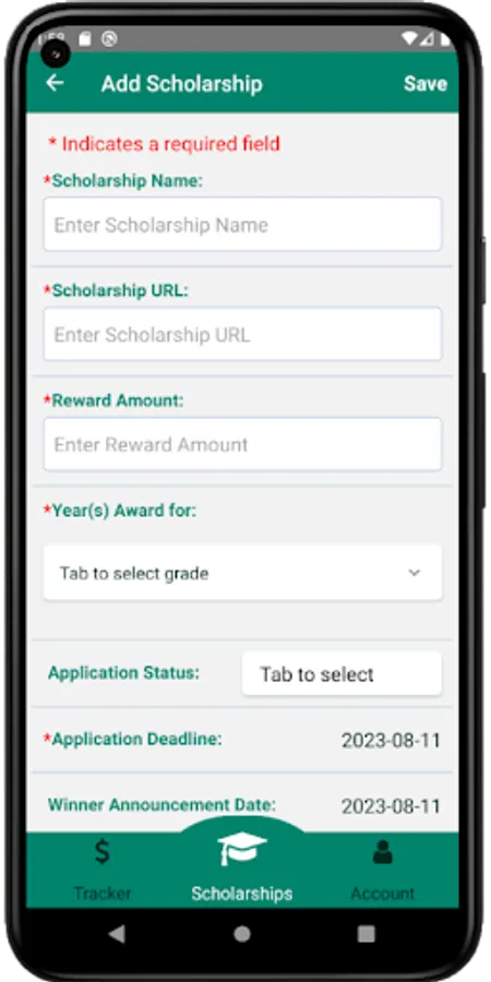 A place for students to keep track of scholarships they want to apply to and receive reminders not only for when it is almost due but also to come back and update whether or not they won it. Also, the app keeps track of how much they have received versus how much they need.
