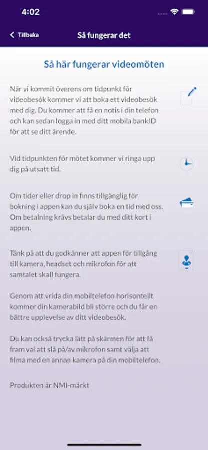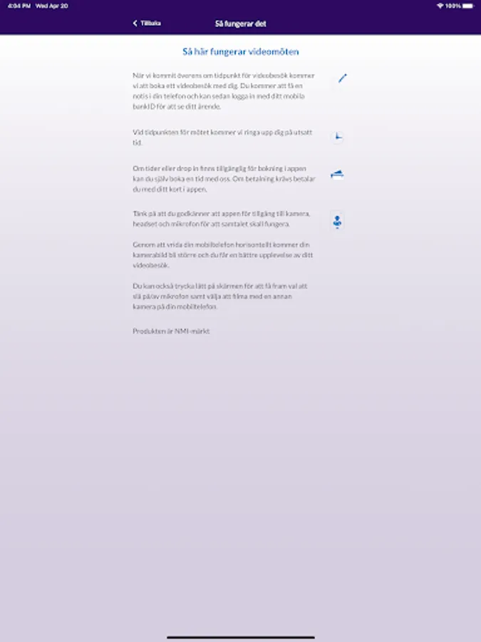 I appen kan du kontakta oss via chatt, boka videosamtal och fylla i hälsodeklaration.