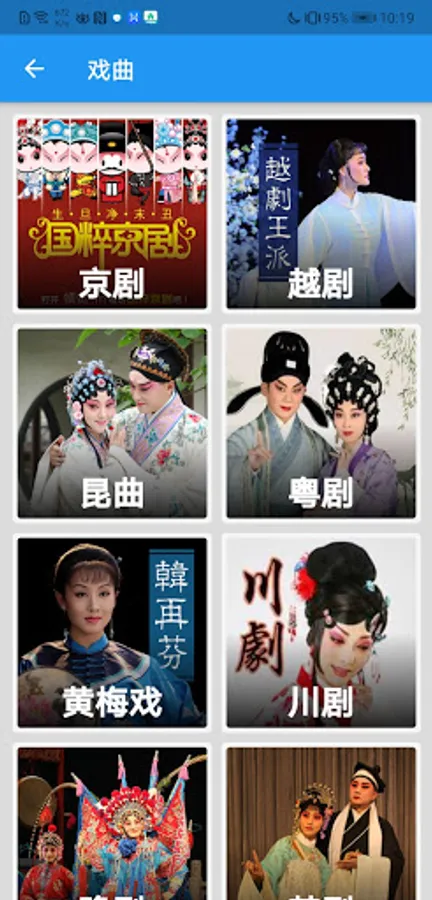Opera: Peking Opera, Yue Opera, Kun Opera, Cantonese Opera, Huangmei Opera, Sichuan Opera and other dialect operas.