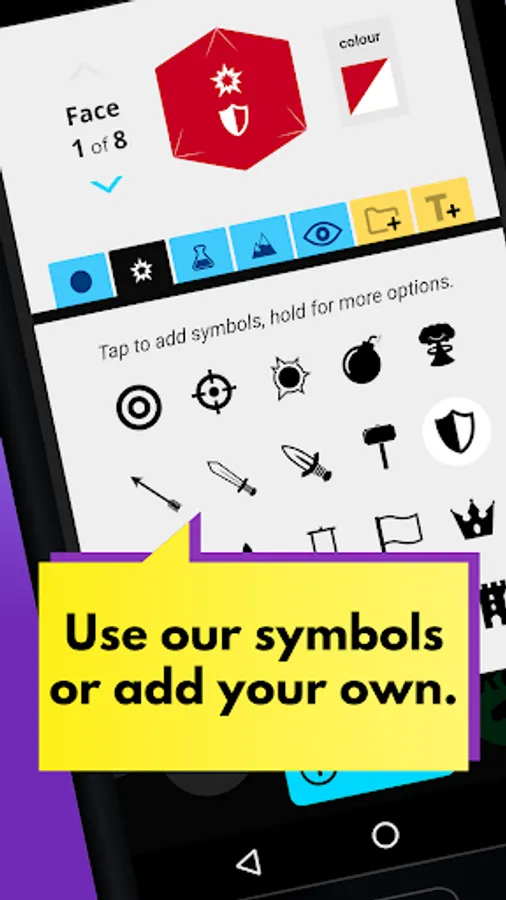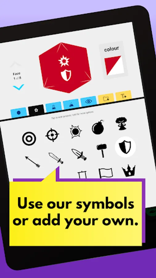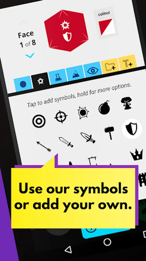 Create & roll any dice in seconds: Use symbols from 5 categories or import your own images & text. From Yahtzee and Backgammon to D&D and Star Wars X-Wing, roll dice for any game in your collection or your imagination.