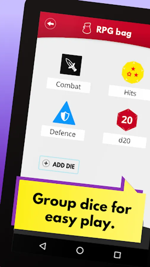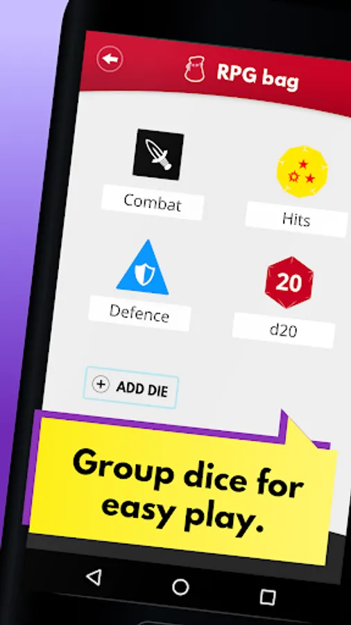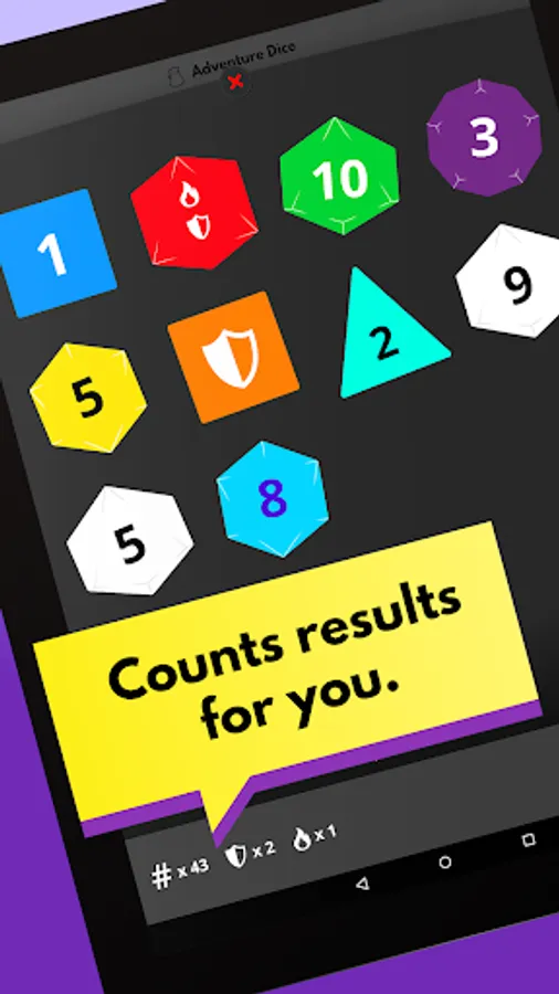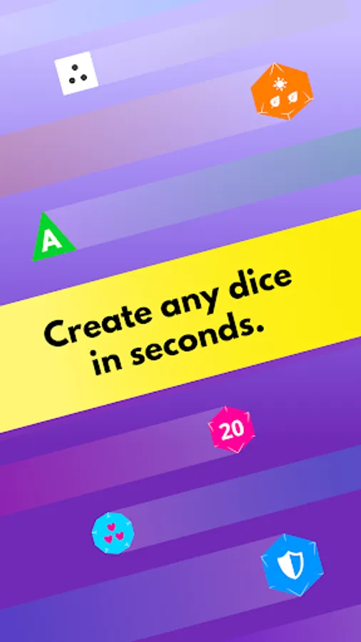 Easy editor: Add simple dice like a d6 or d20 in no time, or dive into the advanced editor to add symbols or different numbers for each face. You can even set different colours on each side.