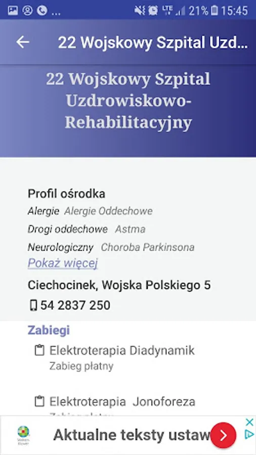 The Tour for Health application is an innovative approach to spa tourism. The application contains a list of sanatoriums and spas from all over Poland, along with information about current events and available attractions in the area. The center's profile includes address data, telephone number, list of treatments performed with information on which of them are payable and which are provided free of charge under the contract with the NFZ.