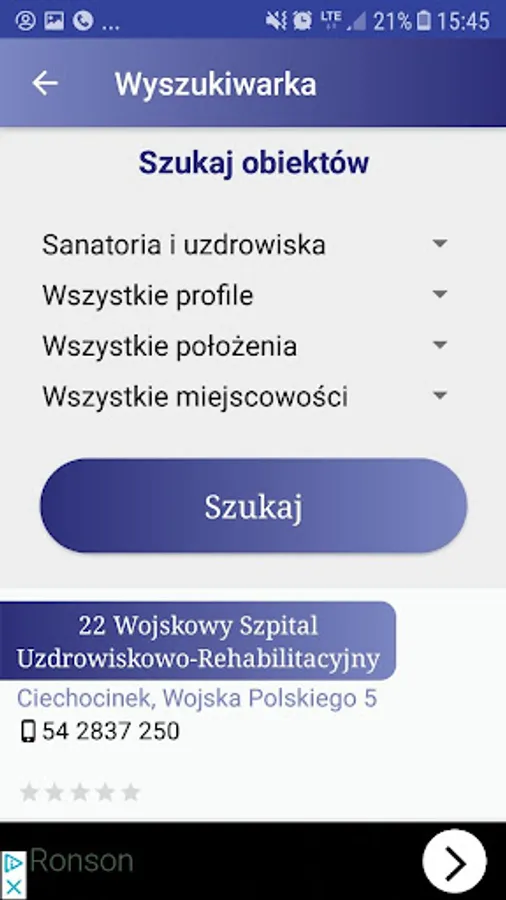Instead of browsing each of the facilities, application users can use the search engine and specify the types of treatments that provide sanatoriums of interest to them. At the same time, when deciding to choose a spa, they can rely on the opinions of other patients, and after their stay, add their own comments.