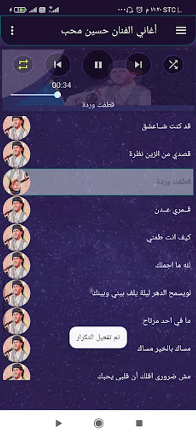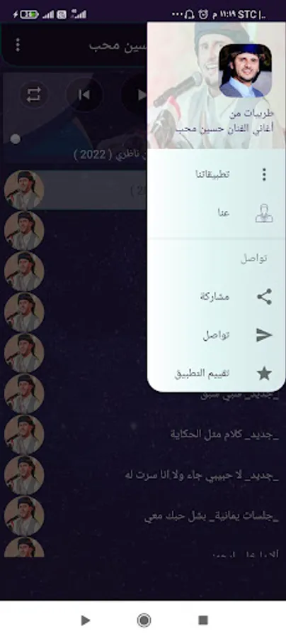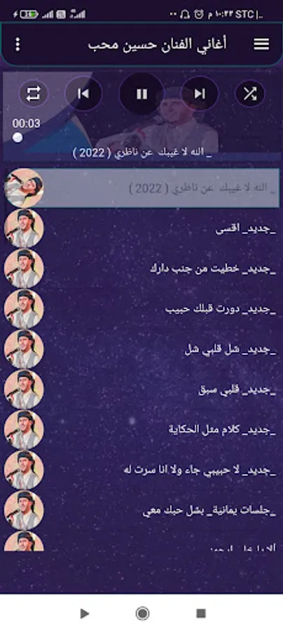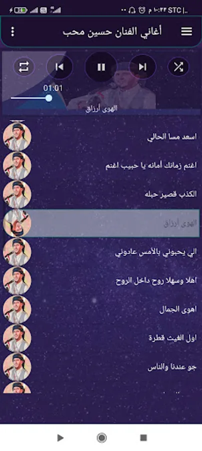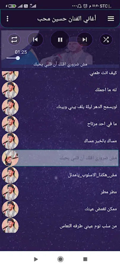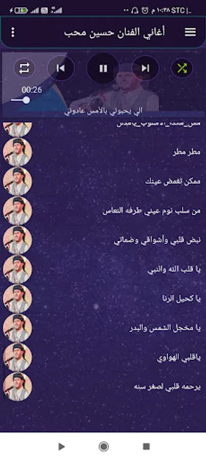 The application of the songs of the artist Hussein Moheb, the application is characterized by a wonderful collection of the songs of Nightingale Hussein Moheb, new and old, the application is characterized by the feature of automatic transition between songs, and also contains the feature of automatic stopping of the sound upon completion of the call