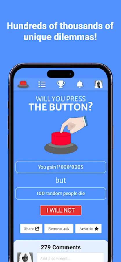 • The dilemmas are designed to be thought-provoking and challenging. They will make you question your own values and beliefs. Will you press the button and become a millionaire, even if it means losing your loved ones? Will you become famous, even if it means losing your privacy?