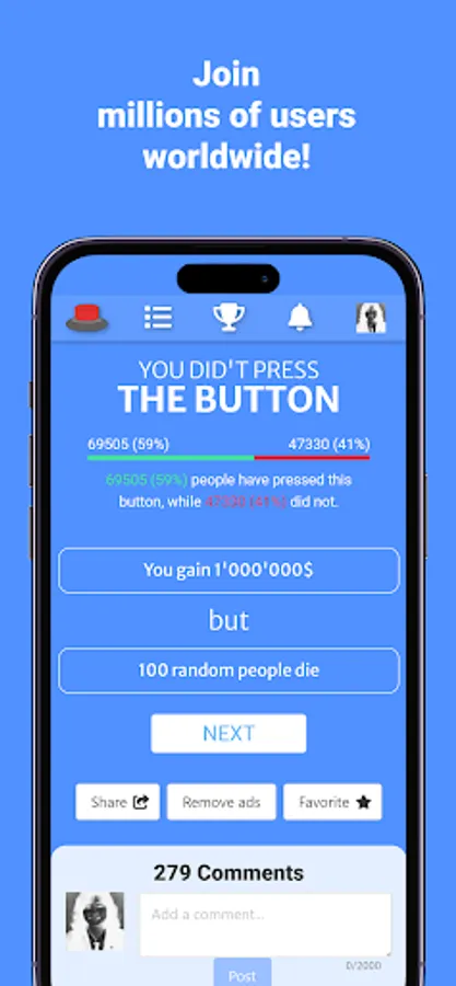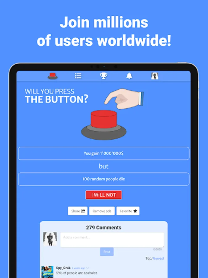 Will You Press The Button? is the ultimate game for testing your ethics, logic, and sense of humor. Download it now and join millions of players who have already Pressed The Button!