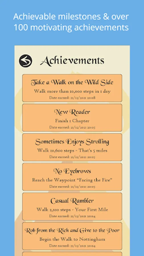 Start building walking habits with achievable goals that increase gradually. A ten-minute walk is all you need to get started. Or, for those who like a challenge, Epic Distance Walks let you test your mettle against distances from famous fantasy maps. There's a perfect walk for everyone!