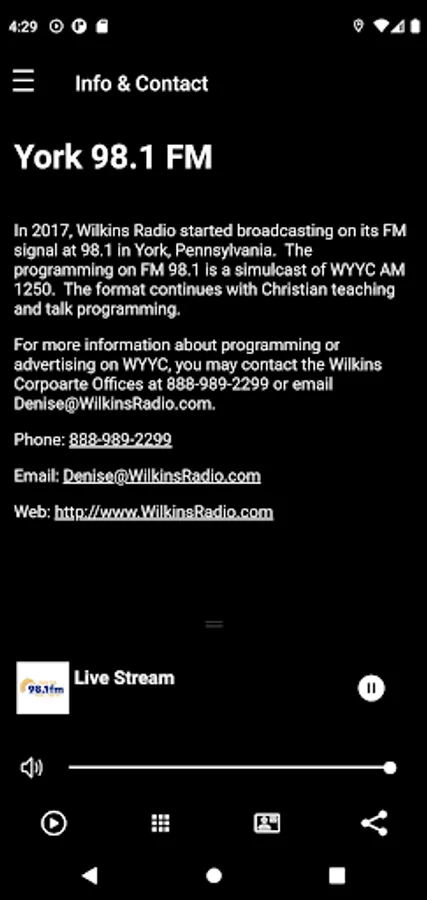 For more information about programming or advertising on WYYC, you may contact the Wilkins Corporate Offices at 888-989-2299.