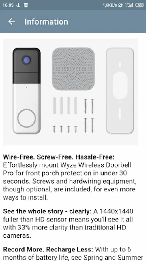 In the content of this app, you can find explanations containing the above titles. The app is a guide with information about Wyze Video Doorbell Pro.