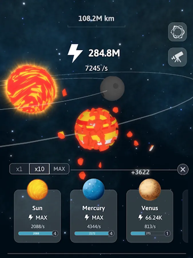 Start with the BIG BANG and tap to create your own universe. In Idle Galaxy, you will create Sun, Mercury, Venus, Earth, Mars, Jupiter and so on, you will have the entire solar system and even the entire universe.