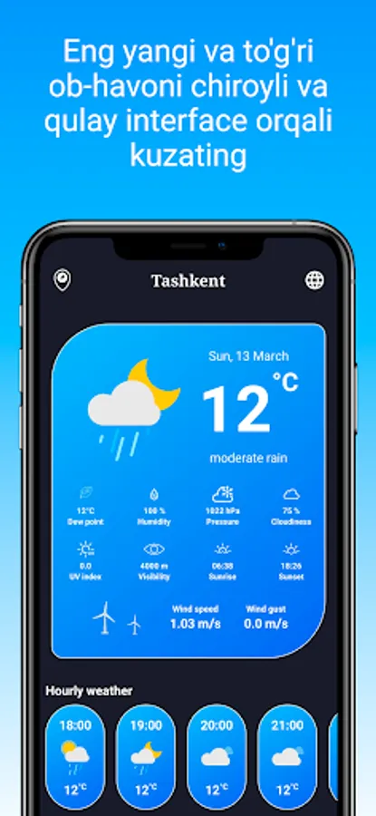 Butun dunyodagi shaxarlarni ayni vaqtdagi, soatlik va kunlik ob-havolarini real vaqtda kuzatishingiz mumkin.