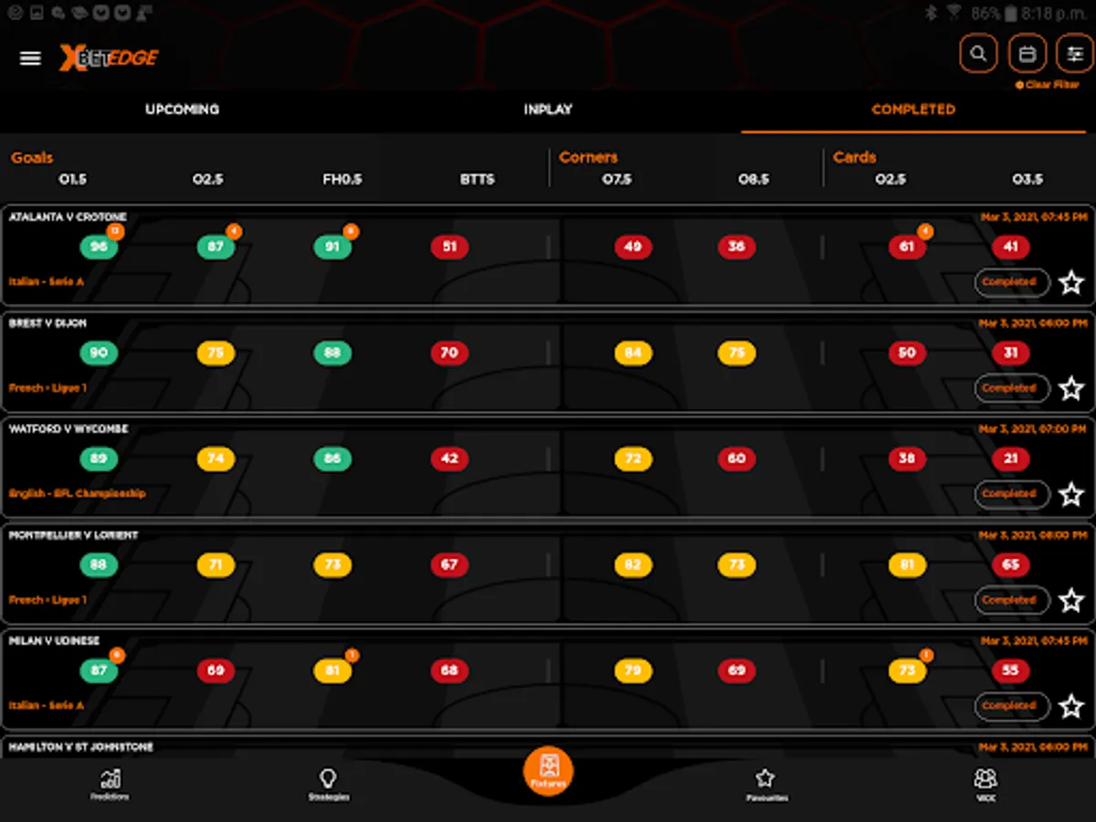 Football predicting has bever been easier! This football predictor and tips app allows you to easily sort the Highest & Lowest probabilities on the main fixture page covering markets like match goals, first half goals, both teams to score, corners & cards to assist you in choosing the right overs or unders market that has the highest chance of winning. You can also filter on the League and Date. Find the best value using this football stats, tips and prediction app, and cut your research down by 85%.