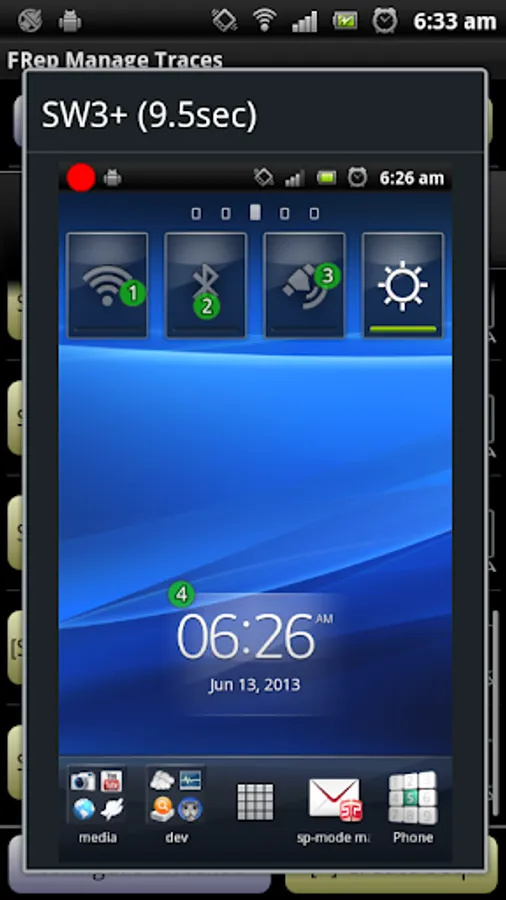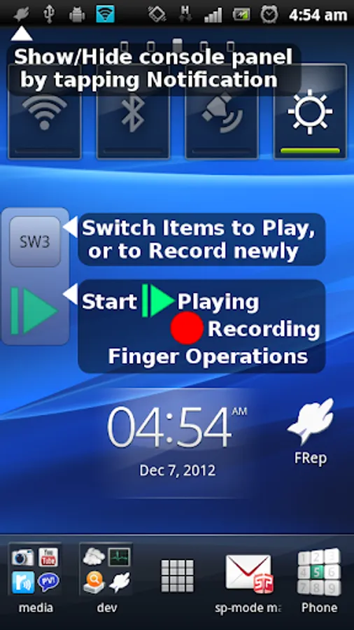 After starting service, FRep will stay in the notification. By tapping it, the console shows/hides. Once you record by the recording circle button, FRep automatically show console on the app on recorded. Then, the record can be replayed by the playing triangle button.