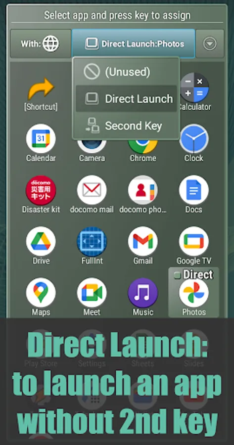 Direct Launch: start designated app/shortcut instantly when the app-launch Func key pushed.