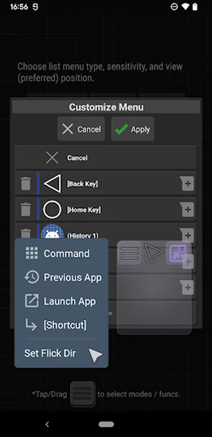 - Customizable flick menu, launch app / shortcut, move to recent app.