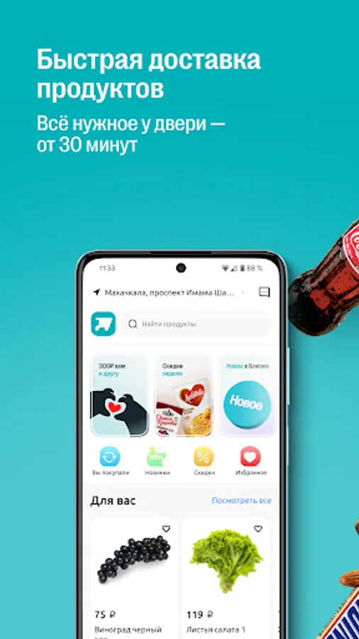 Download the app, select everything you usually buy in-store, and enter your address. Our couriers will deliver everything to your home, and for orders over 500₽, we'll deliver for free.