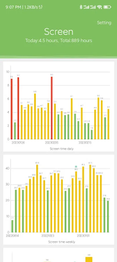 * Record daily bright screen time and generate daily, weekly, and monthly statistical charts.