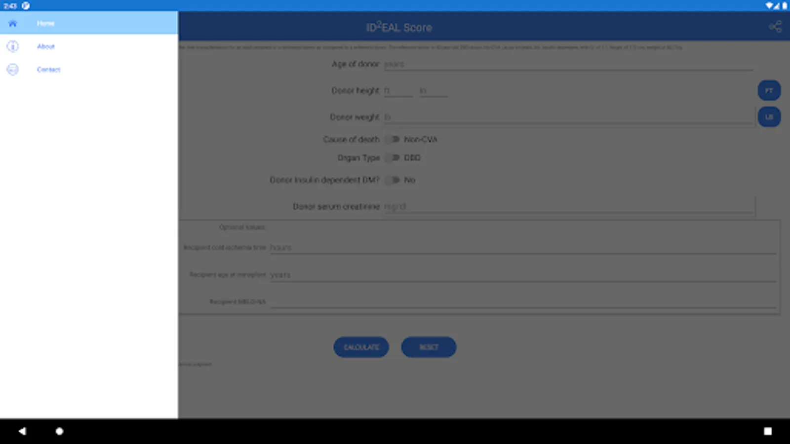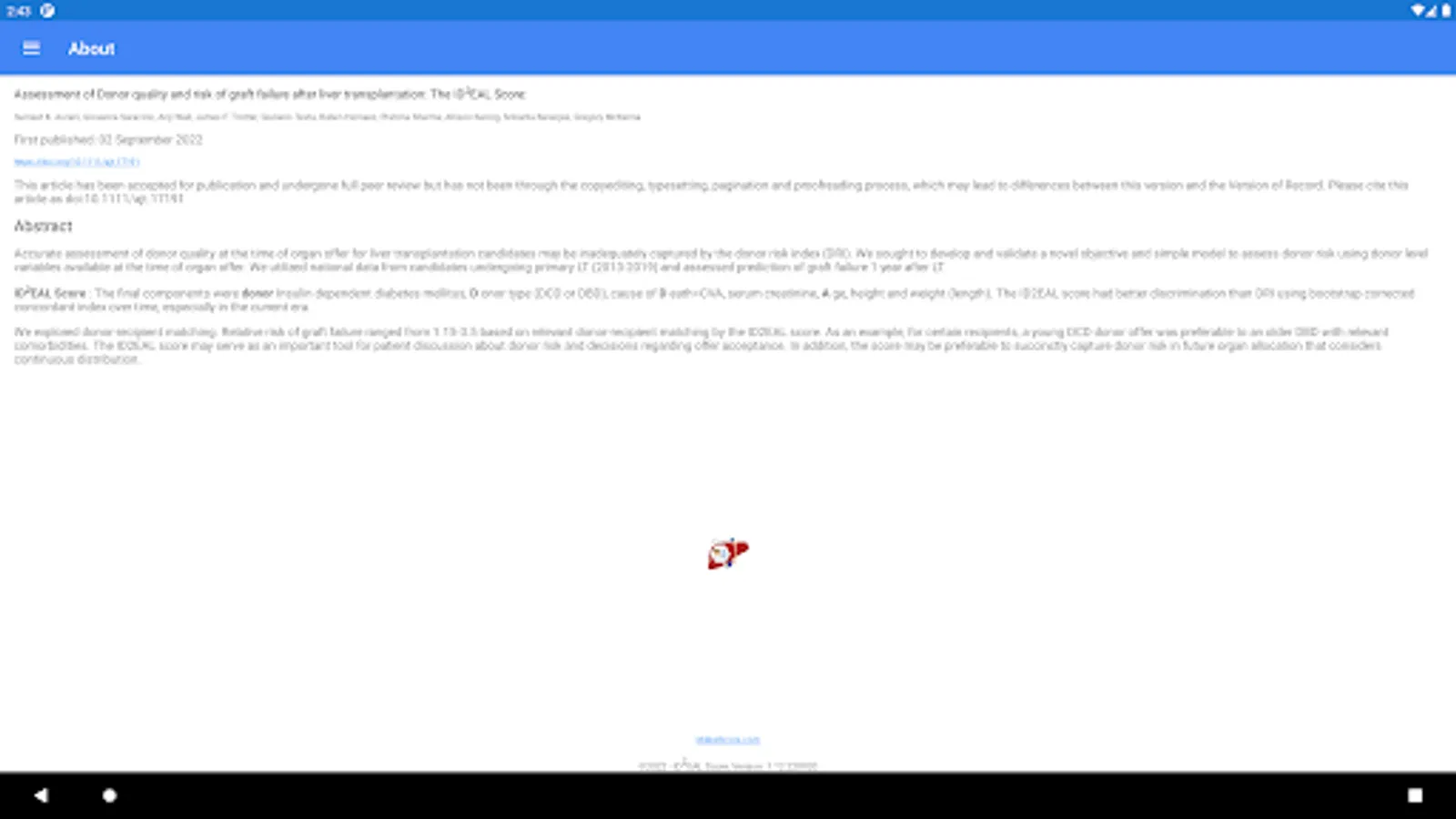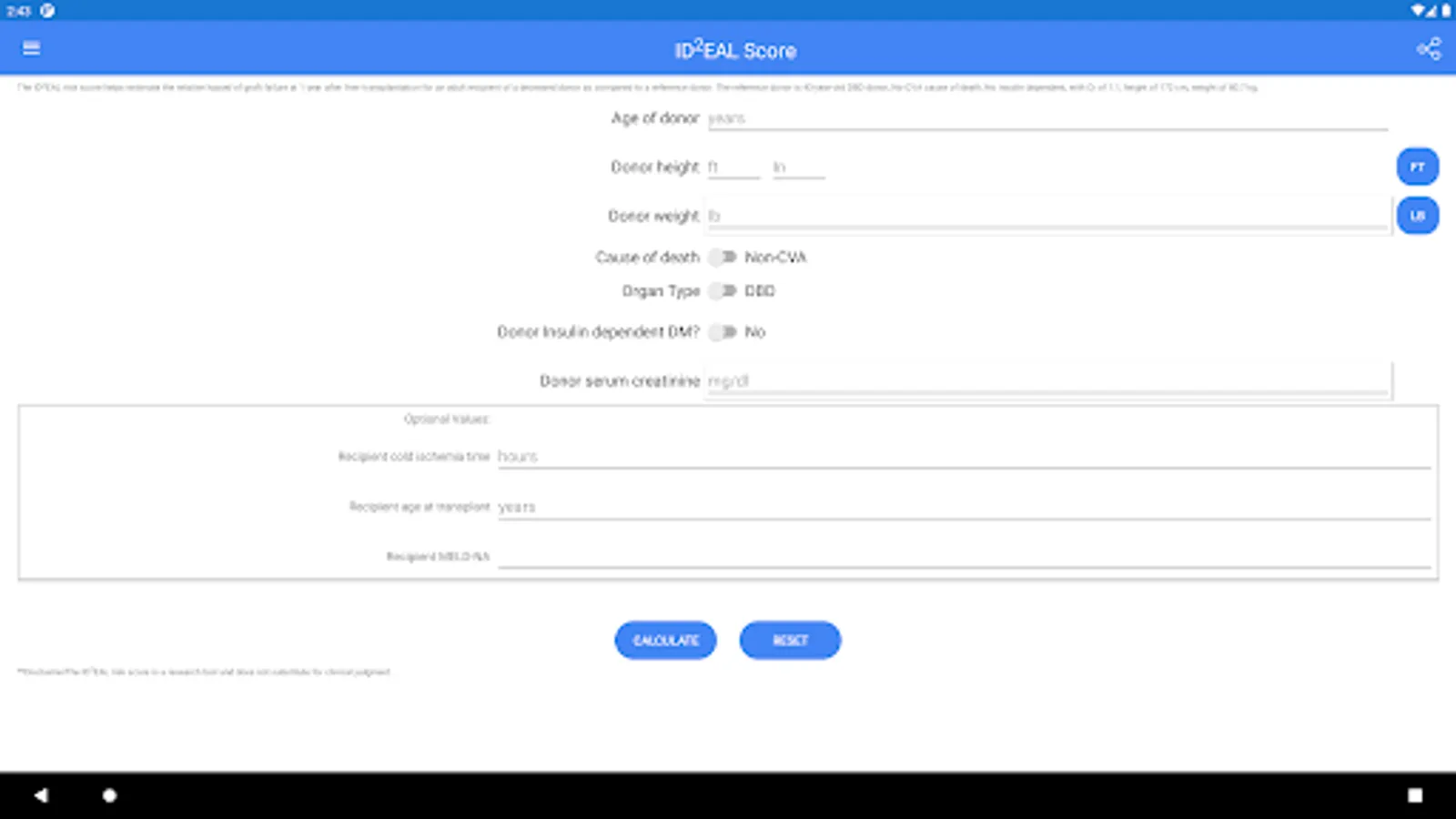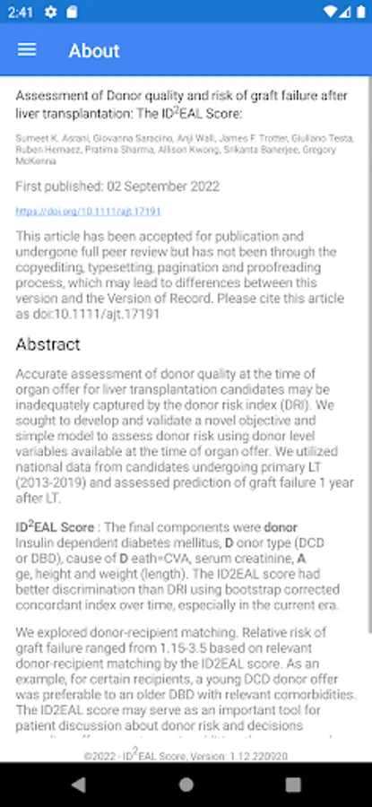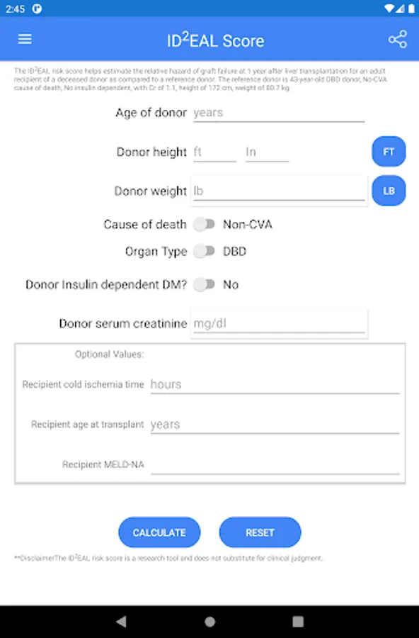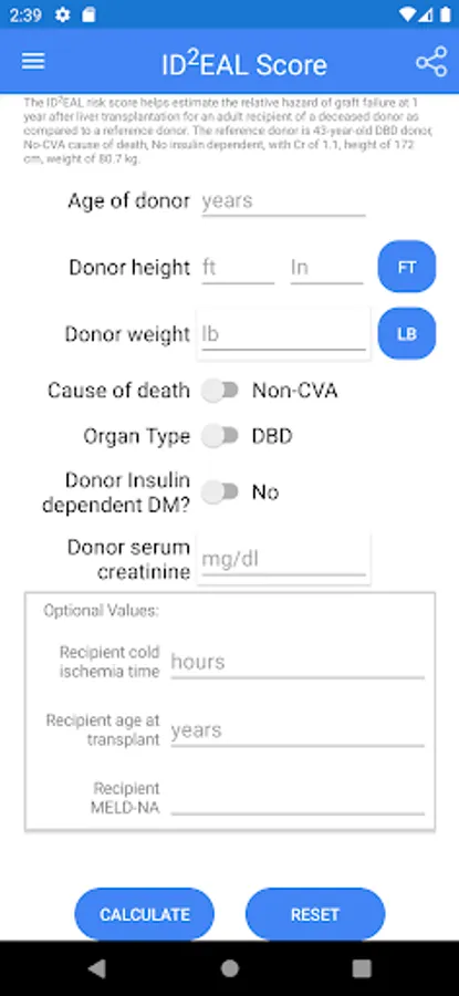 The IDDEAL risk score helps estimate the relative hazard of graft failure at 1 year after liver transplantation for an adult recipient of a deceased donor as compared to a reference donor. The reference donor is 43-year-old DBD donor, No-CVA cause of death, No insulin dependent, with Cr of 1.1, height of 172 cm, weight of 80.7 kg.