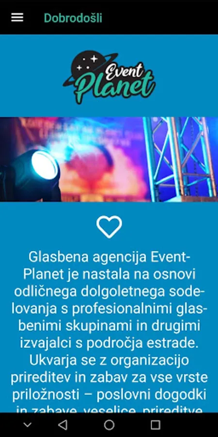 EventPlanet is based on a longstanding collaboration with professional music groups and other artists in the field of entertainment. He organizes events and parties for all kinds of occasions - business events and parties, parties, events from national celebrations, birthday parties, etc. Our agency's mission is to provide the client with an effective and consistent event at the highest possible professional level. Quality, responsiveness and a willingness to finally complete your unforgettable event are our first priority. In the future we want to become the most recognized music agency in Slovenia.
