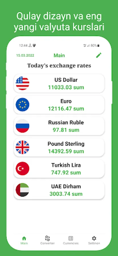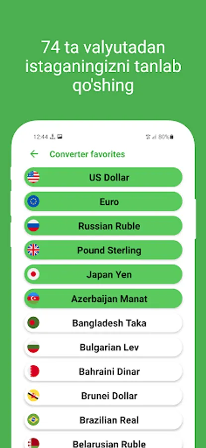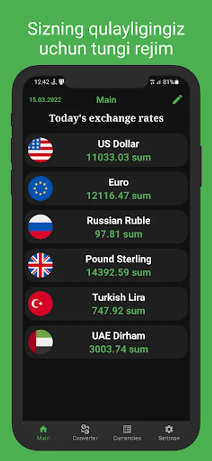 - Asosiy va konverter menyulariga o'zingiz istagan 74 ta valyutadan tanlab qo'sha olasiz.