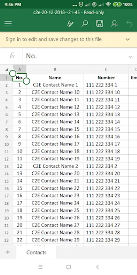 - Excel file contains (Name, First Name, Middle Name, Family Name, Number and its type, Email, Nickname, Organization, Address, IM, Website and Notes).