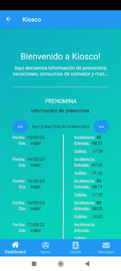 This is the version of Kiosco Web you already know but its mobile version, easy to consult to connect anywhere outside centers Telvista, get updates on your schedule information, holiday balance, consumption in cafeteria summary of prenómina and plus. Convenient to use, free of ads and only what you want to know.