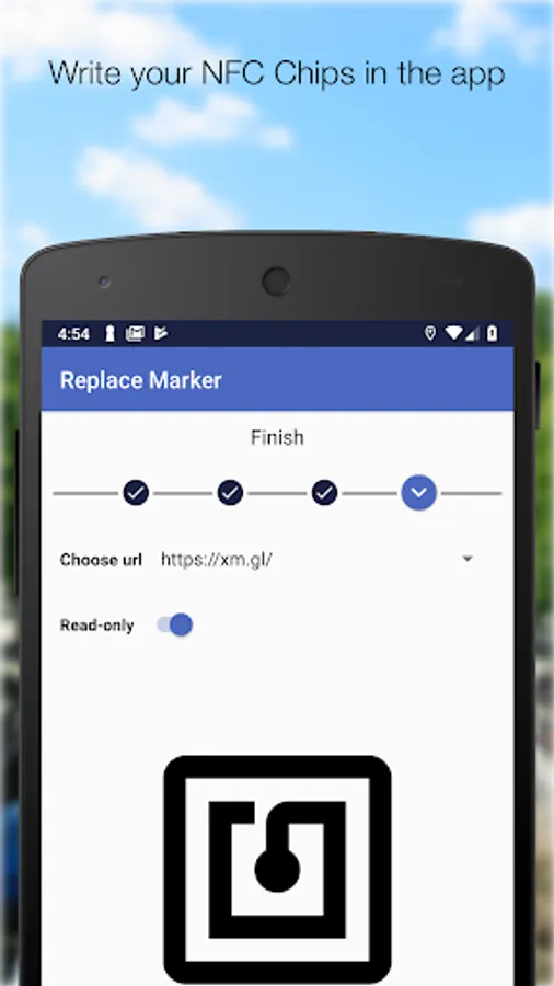 3. The NFC tag will be written safely (write protected) with one tap. Writing IDs for iBeacons and Eddystones require that your beacon vendor allows this. In this case you just copy the IDs from the service app and paste it into your vendor’s app.