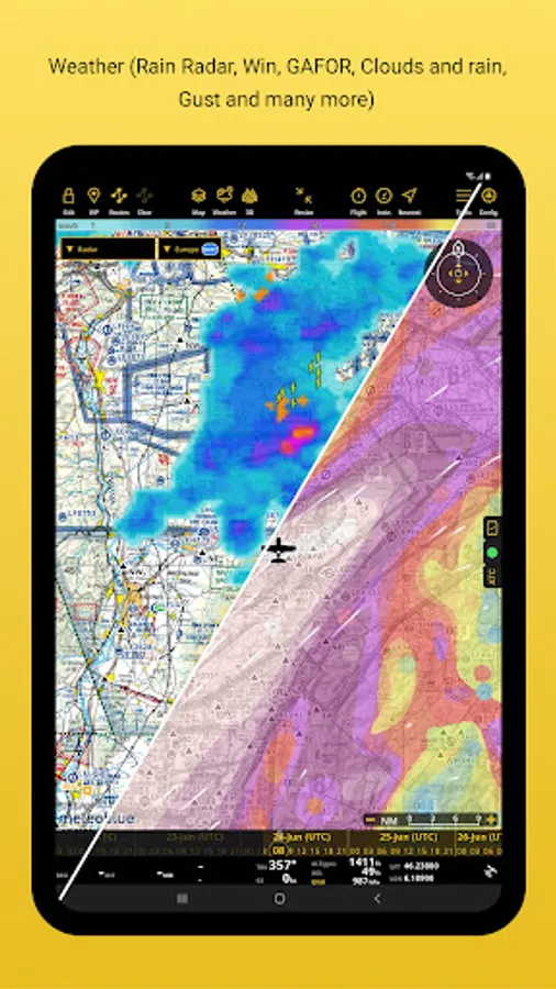 Display data: Rain Radar, Wind, GAFOR (CH&DE), Pressure, Clouds and rain, Visibility, Gust, on your moving map