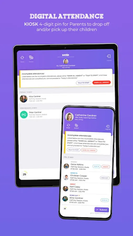 Our app allows your staff and parents to sign in using our Kiosk system which will help you automate your sign in and sign out process.